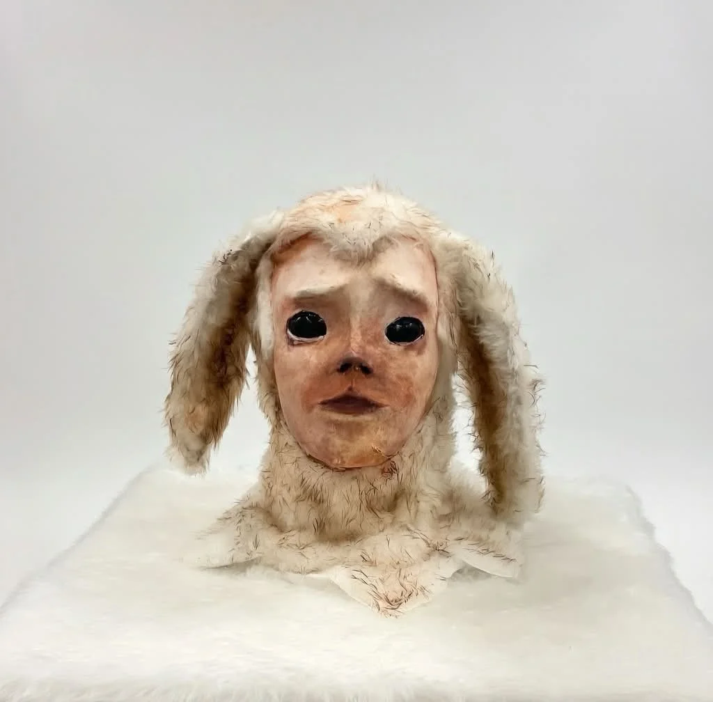 Rabbit-human hybrid made from deer skin, oil paints, faux fur.